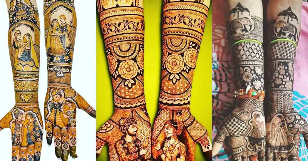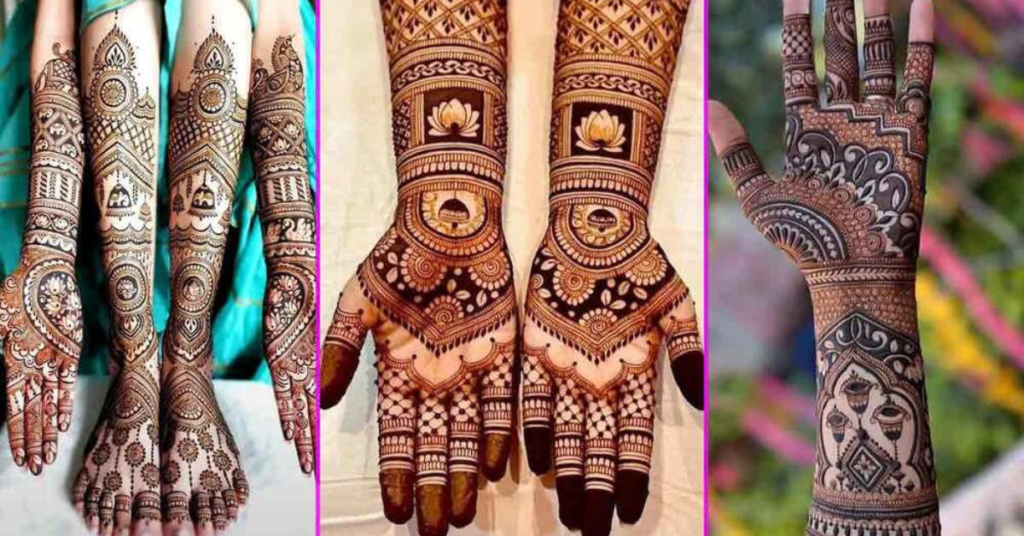 Bridal Full Hand Mehndi Design दुल्हनों के लिए सबसे खास होती है। इसमें बारीक और डिटेल्ड पैटर्न जैसे दूल्हा-दुल्हन की आकृति, बारात सीन, और ट्रेडिशनल मोटिफ्स शामिल होते हैं। यह डिजाइन काफी समय लेता है लेकिन देखने में बेहद आकर्षक लगता है।
