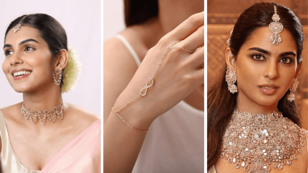 - नथ (नकली या असली मोती-कुंदन की नाक की बाली) और हाफमून झुमके लुक को संपूर्ण बनाते हैं।