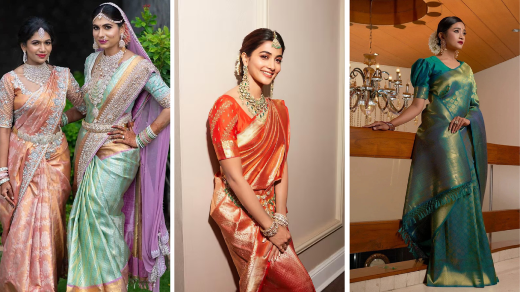 7) दो रंगों की कांजीवरम साड़ी लुक