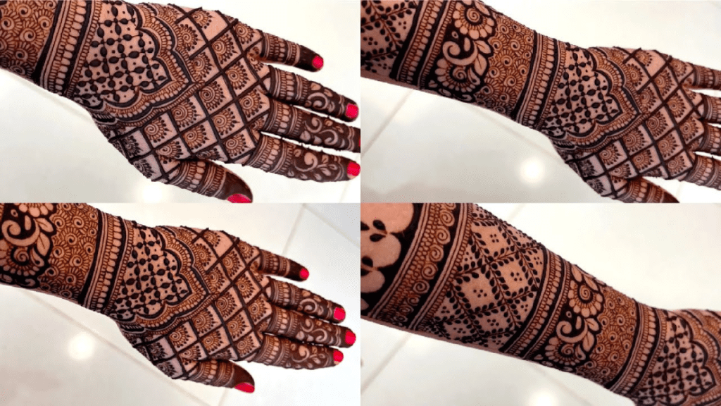 सिंपल लाइन्स, छोटे-छोटे मोटिफ और स्पेस वाली मेहंदी, जो जल्दी बनती है और मॉडर्न लुक देती है