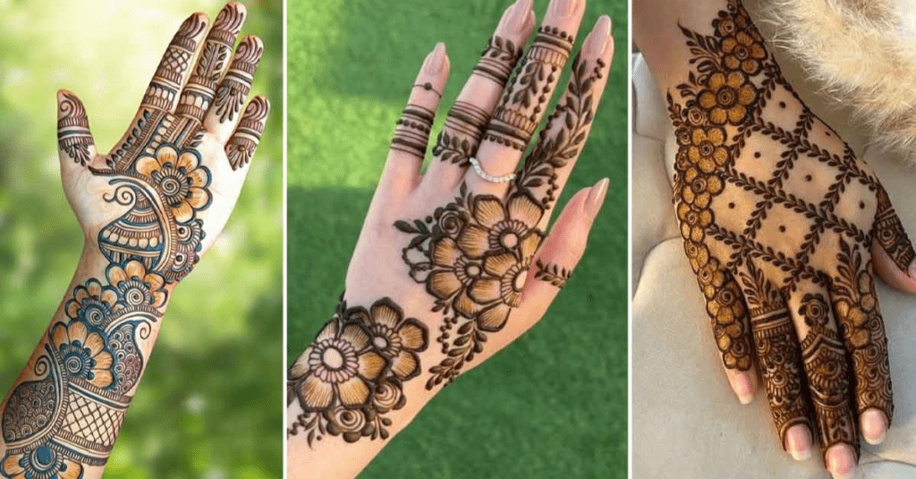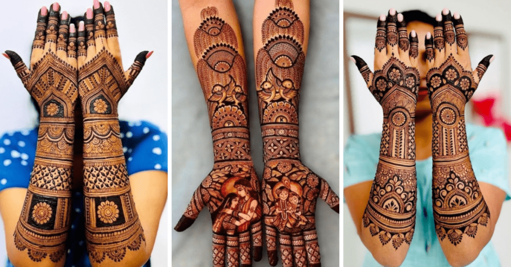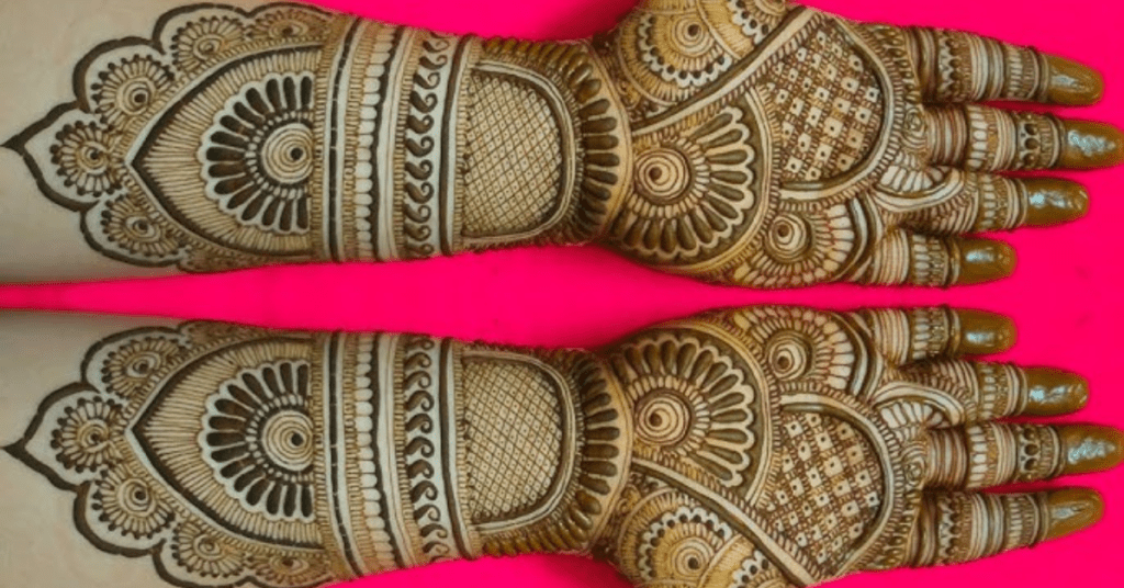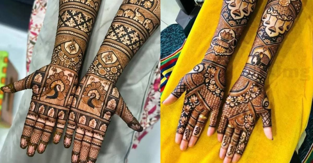 Full Hand Mehndi Design में हाथों को पूरी तरह कवर किया जाता है। इसमें बेल, फूल, पेसली और जालीदार पैटर्न का उपयोग किया जाता है, जो शादी के लिए परफेक्ट है।